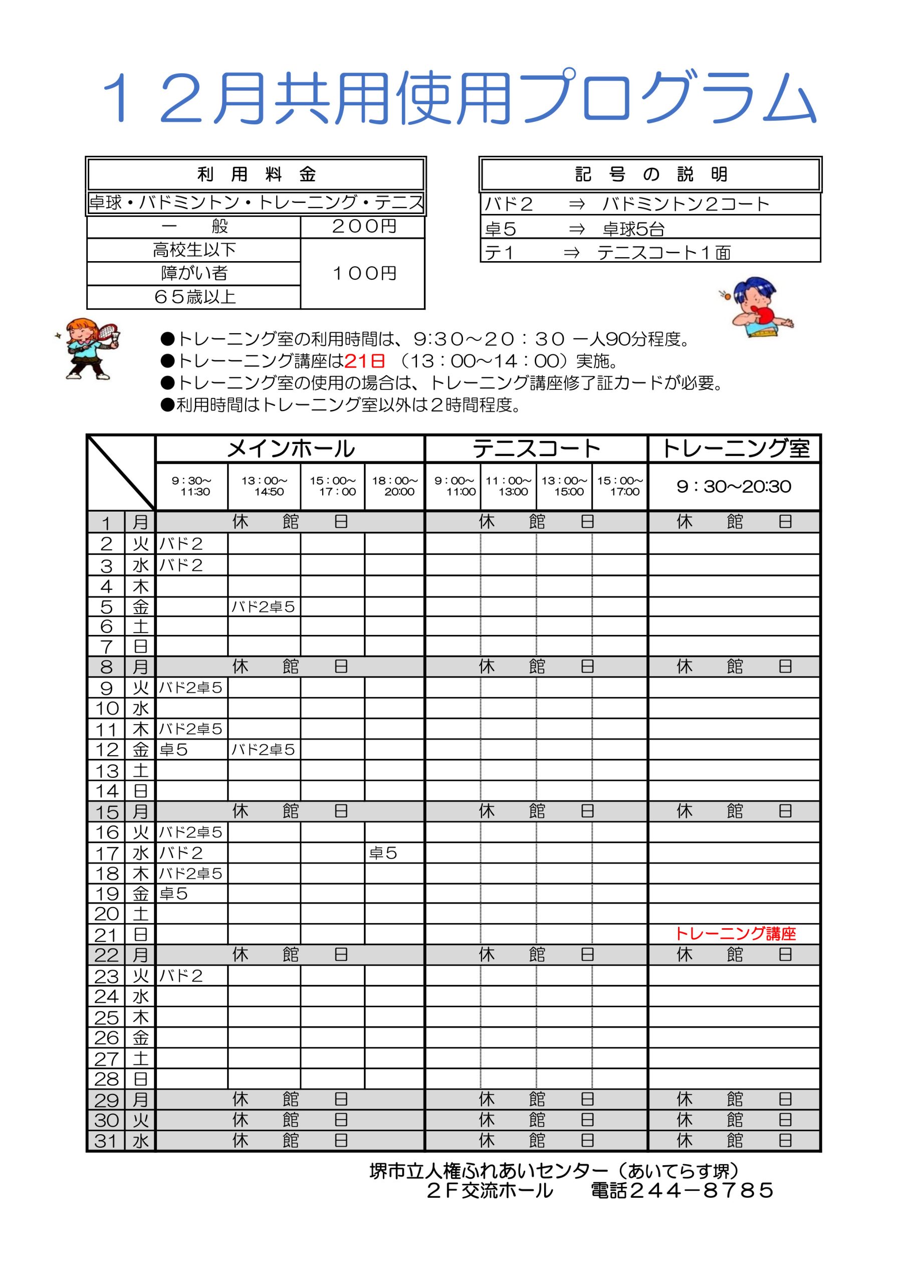 ※トレーニング講座開催時は、トレ-ニング室は使用できません。